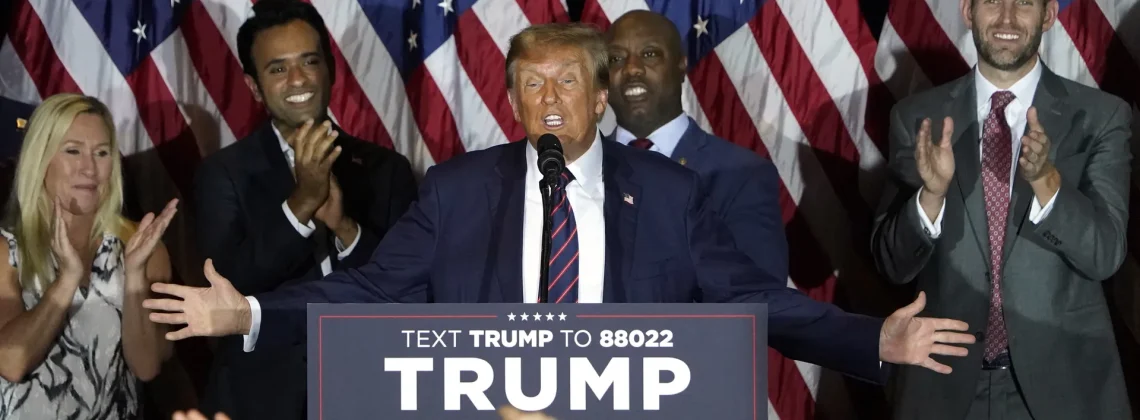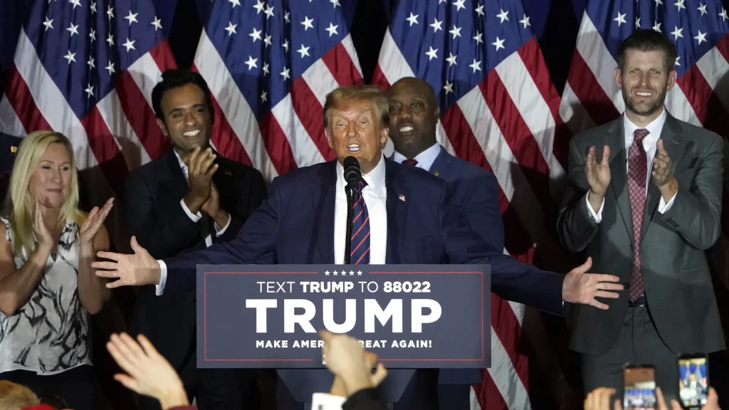 Notice that he had Tim Scott, Vivek Ramaswamy, and Marjorie Taylor Greene behind him as he said: 1). He won New Hampshire in the general election (he lost it to Hillary Clinton 2016 and to Biden in 2020); 2). New Hampshire allows Democrats to vote in the Republican primary (registered Democrats are not allowed to vote in the GOP primary; and 3). He won the 2020 general election.