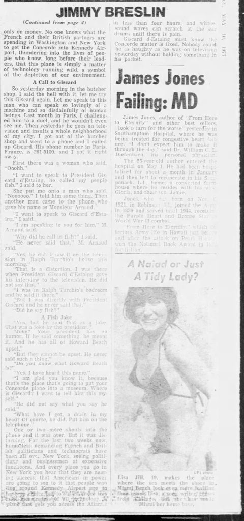 Some of the columns I remember reading as a kid, including the columns he wrote about Howard Beach’s fight against France over the landing of the noisy Concorde jet in John F. Kennedy Airport. Breslin even flew to France to defend the people of this Queens neighborhood. He summarized the entire affair in an essay from The World According to Jimmy Breslin (1984) titled, “How I Shot Down the Concorde All By Myself.” Editor Dan Barry chose to put this essay in the LOA’s Essential Writings collection.