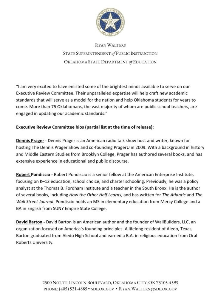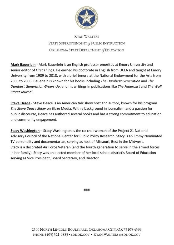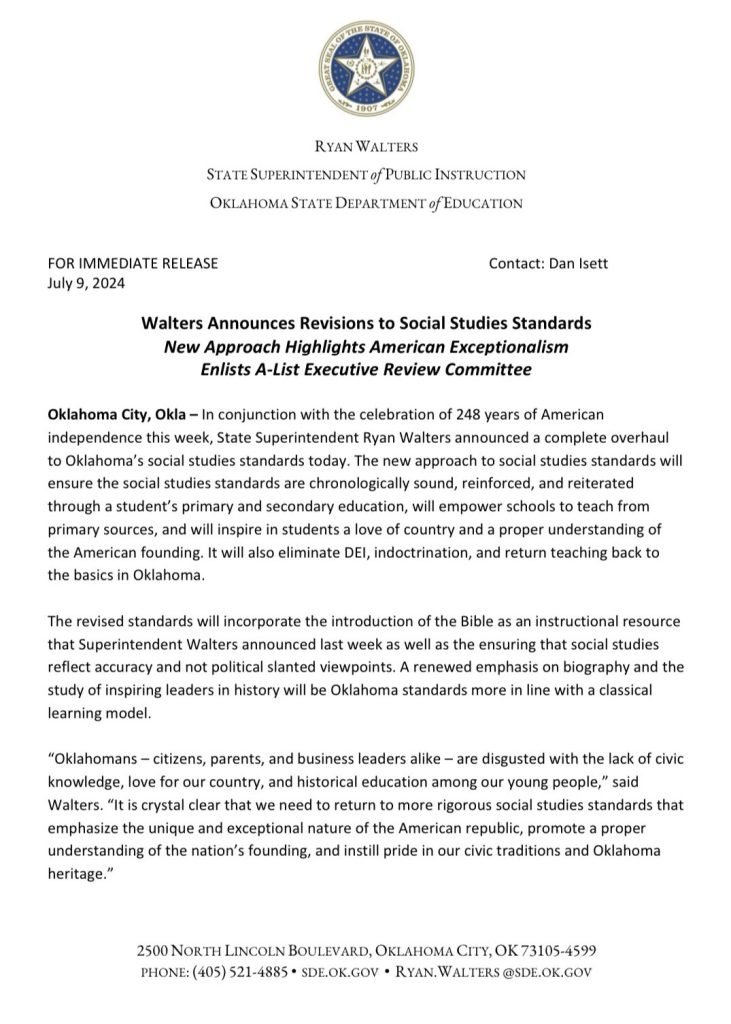 “Oklahomans, citizens, parents, and business leaders alike, are disgusted with the lack of civic knowledge, love for our country, and historical education among our young people,” Walters said. “It is crystal clear that we need to return to more rigorous social studies standards that emphasize the unique and exceptional nature of the American republic, promote a proper understanding of the nation’s founding, and instill pride in our civic traditions and Oklahoma heritage.”