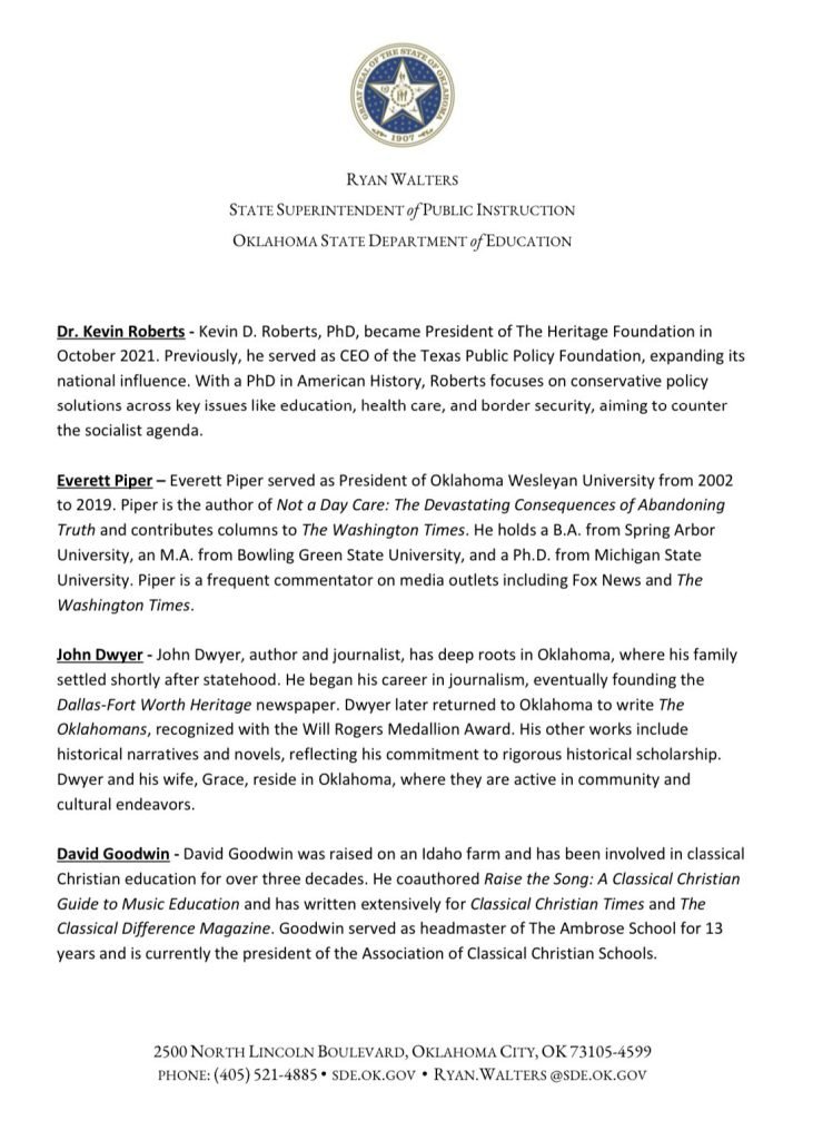 “Teacher’s unions have been rewriting history, teaching students to hate America. But not under my watch,” Walters told the Washington Examiner. “Our goal is to give Oklahoma students an education that focuses on history, not indoctrination. The executive committee that we’ve assembled are experts in American exceptionalism, our Founding Fathers, and historical documents like the Bible. These things are essential to understanding our history.”