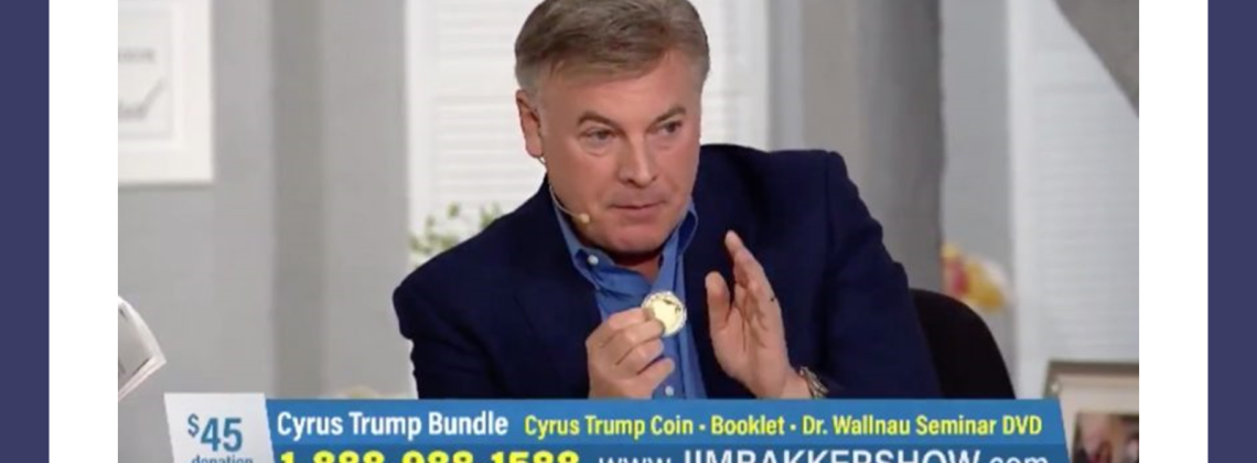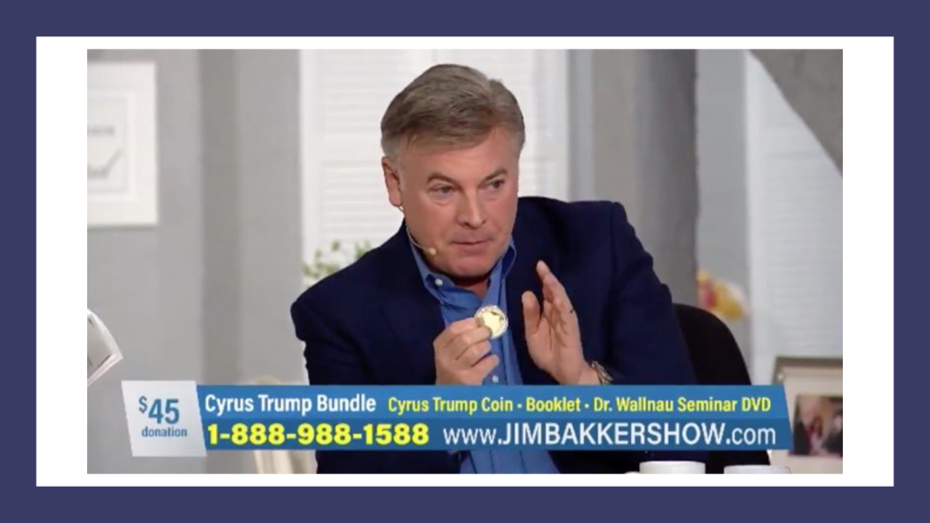 - Hawked King Cyrus coins on the television show of disgraced televangelist Jim Bakker.